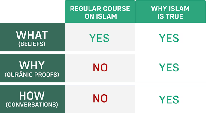 This is how the Why Islam Is True course is different from anything else you’ve seen. A regular course on Islam only teaches you the “what”, i.e., what Islam is about. And it stops there. Why Islam Is True goes two steps further than the “what”.